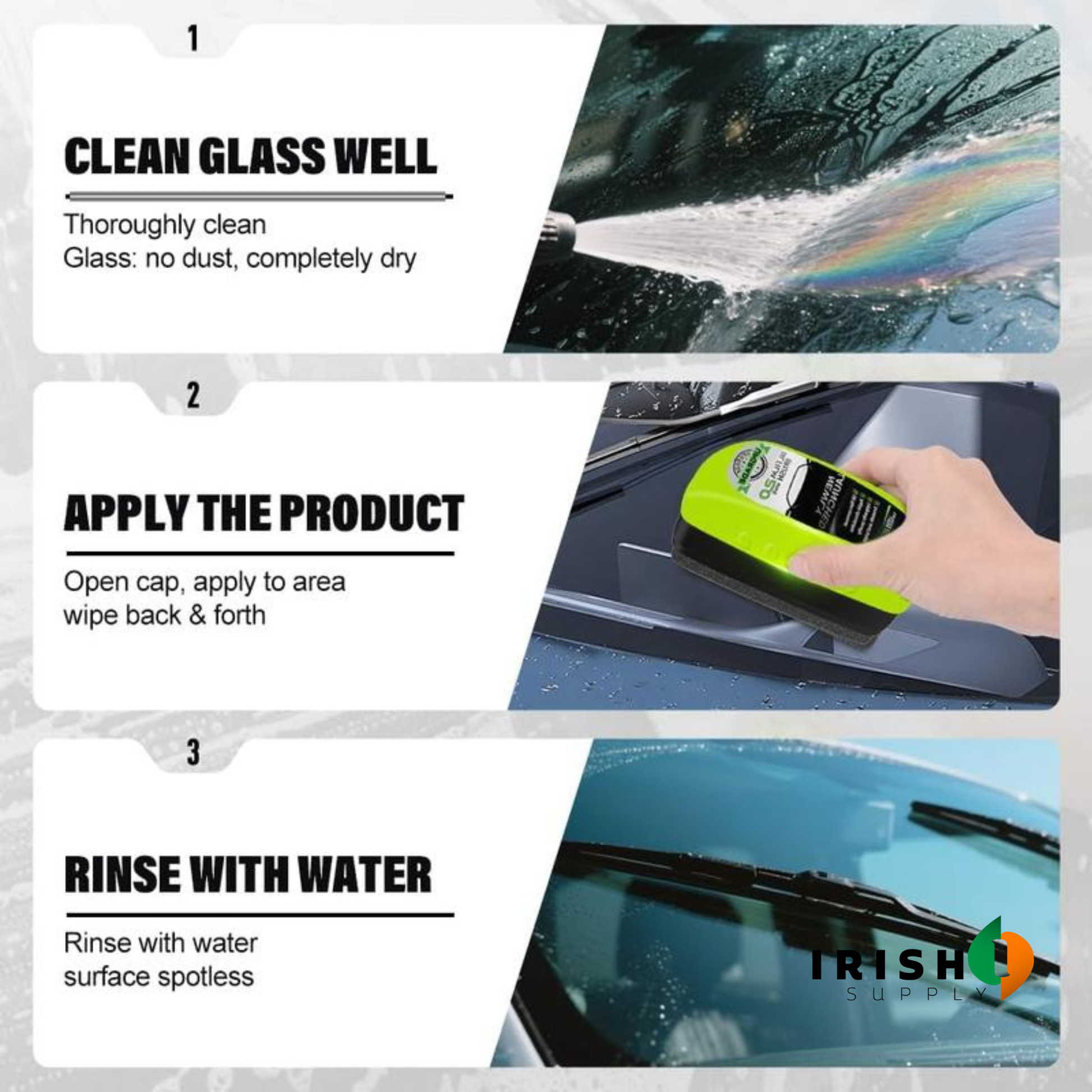 Step 3 – Wipe away residue with water or a cloth — and enjoy clear, streak-free visibility.