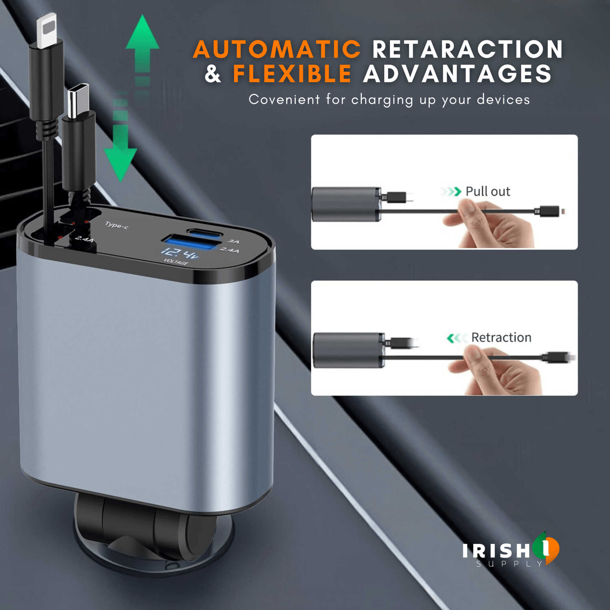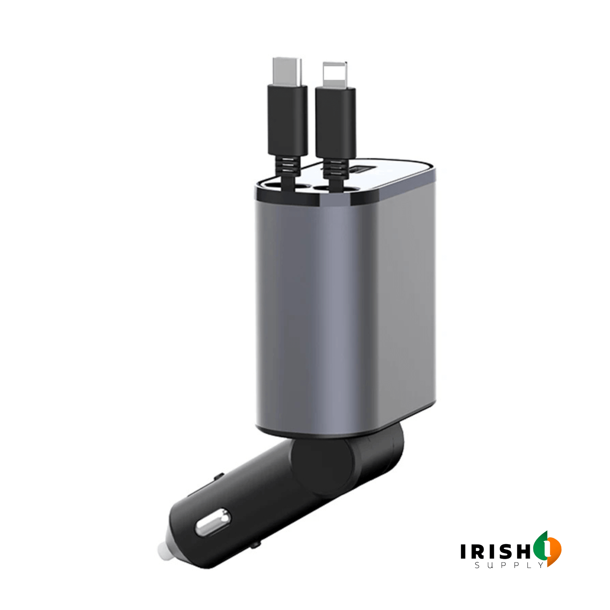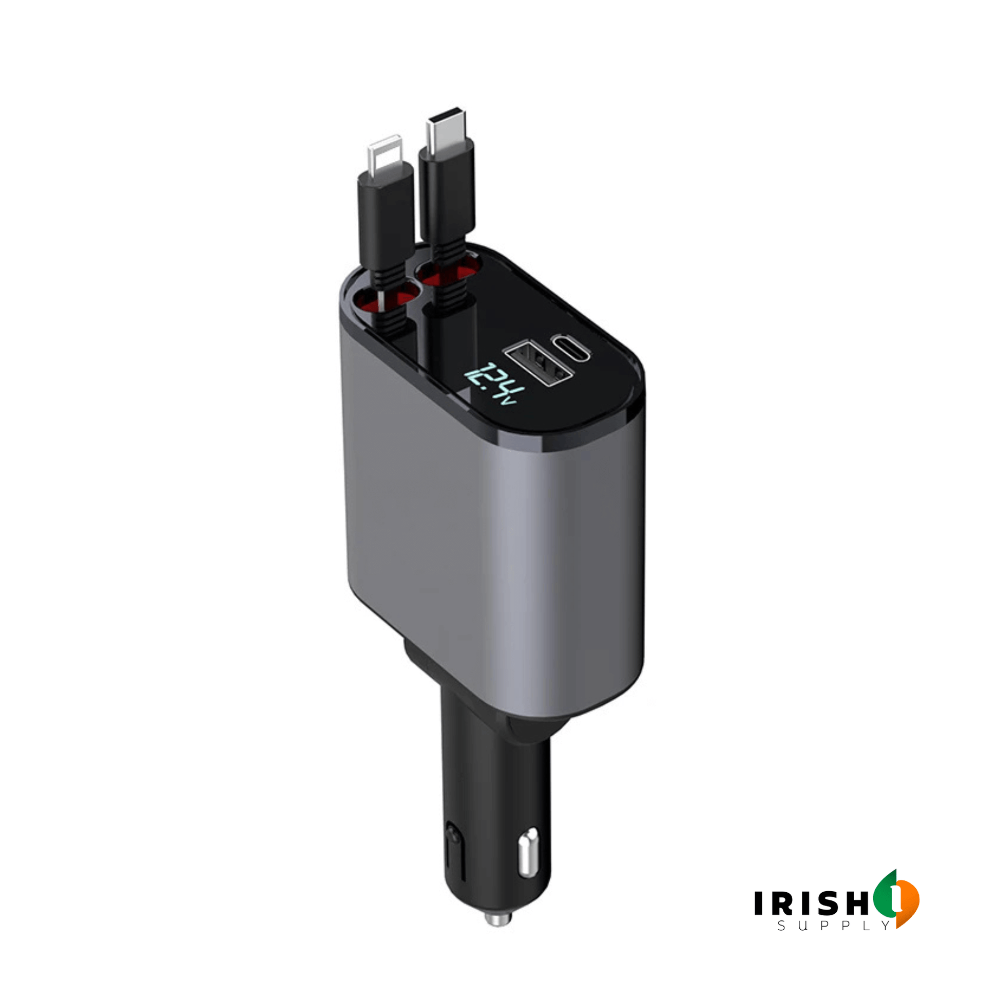 Experience the convenience of fast charging with our car charger's advanced technology. Equipped with two retractable cables (iOS and Android Type C), as well as one USB A and one PD port, you can enjoy efficient charging for all your devices.