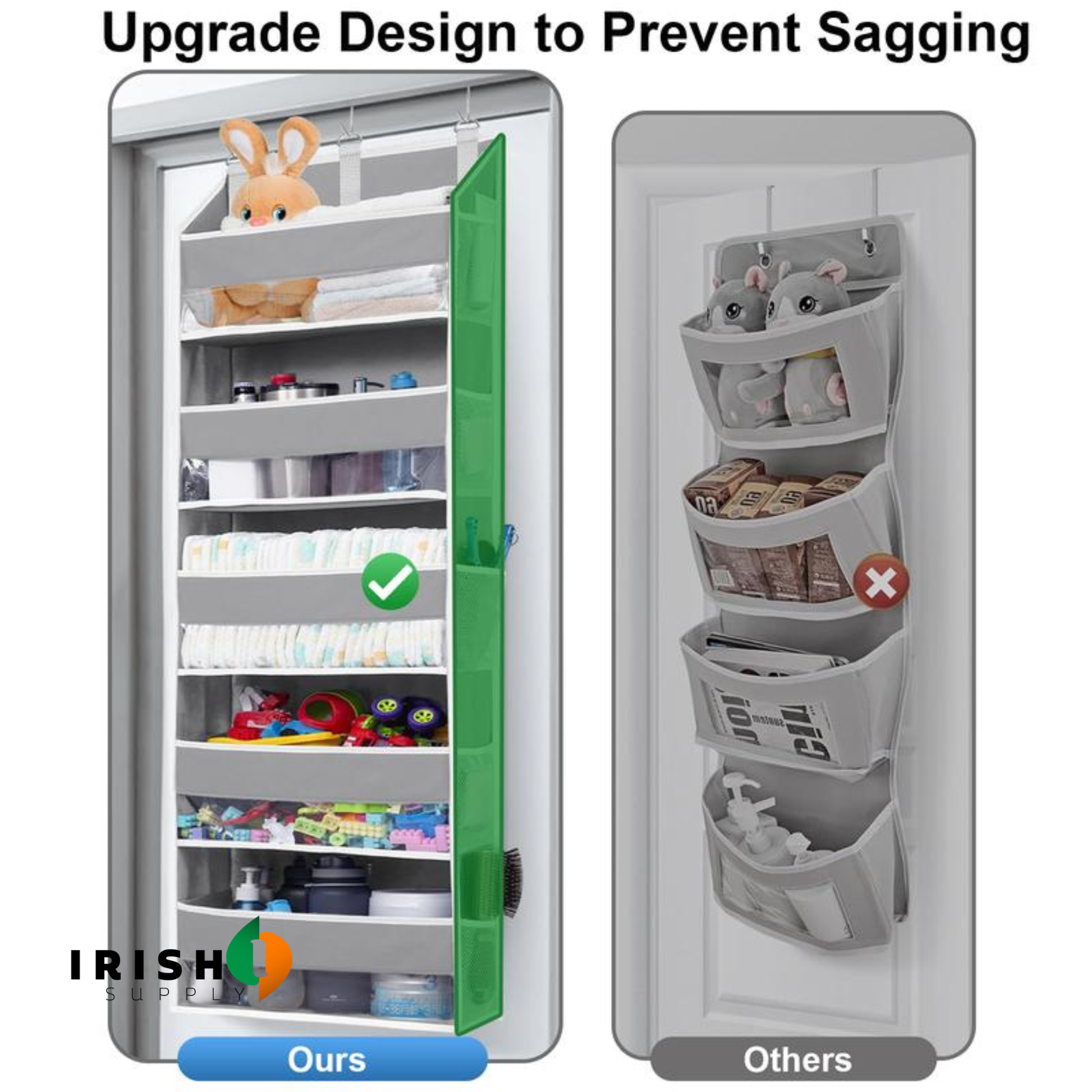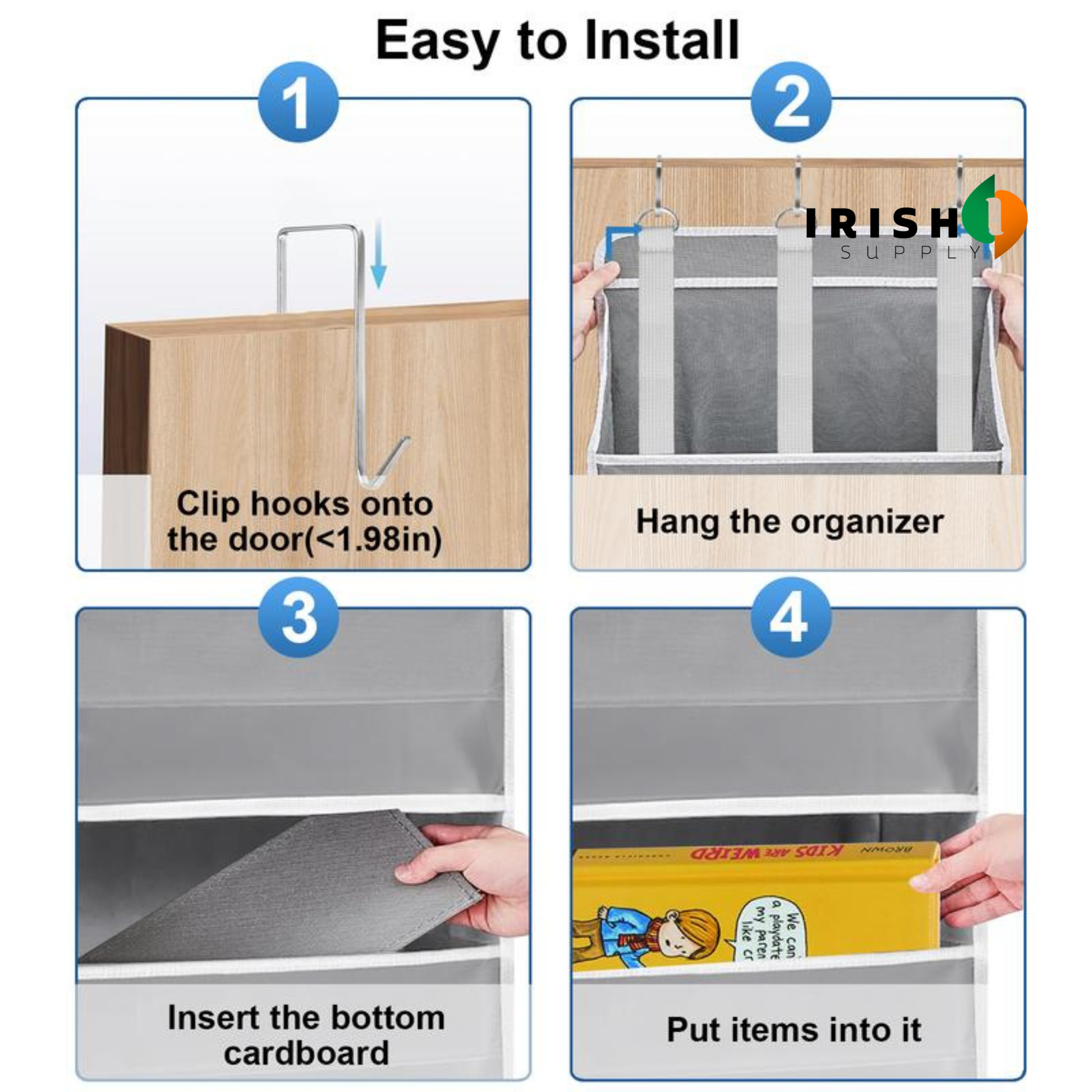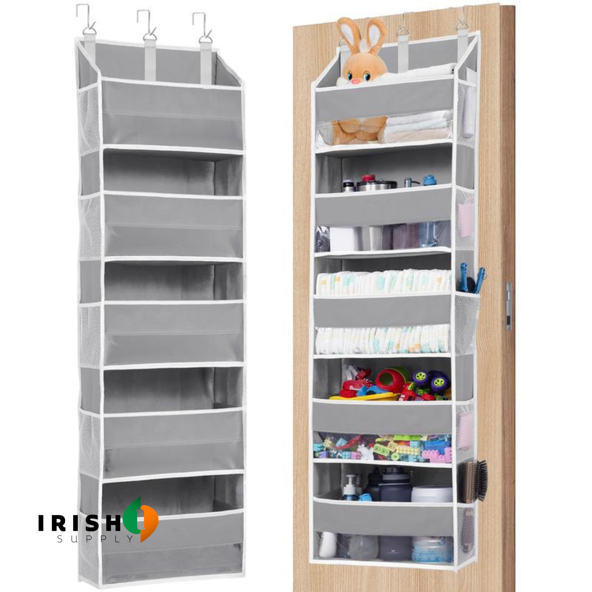 Will it fit my door? Yes. It fits standard Irish doors — hollow core, solid wood, panelled. The hooks sit over the frame with no modification needed.