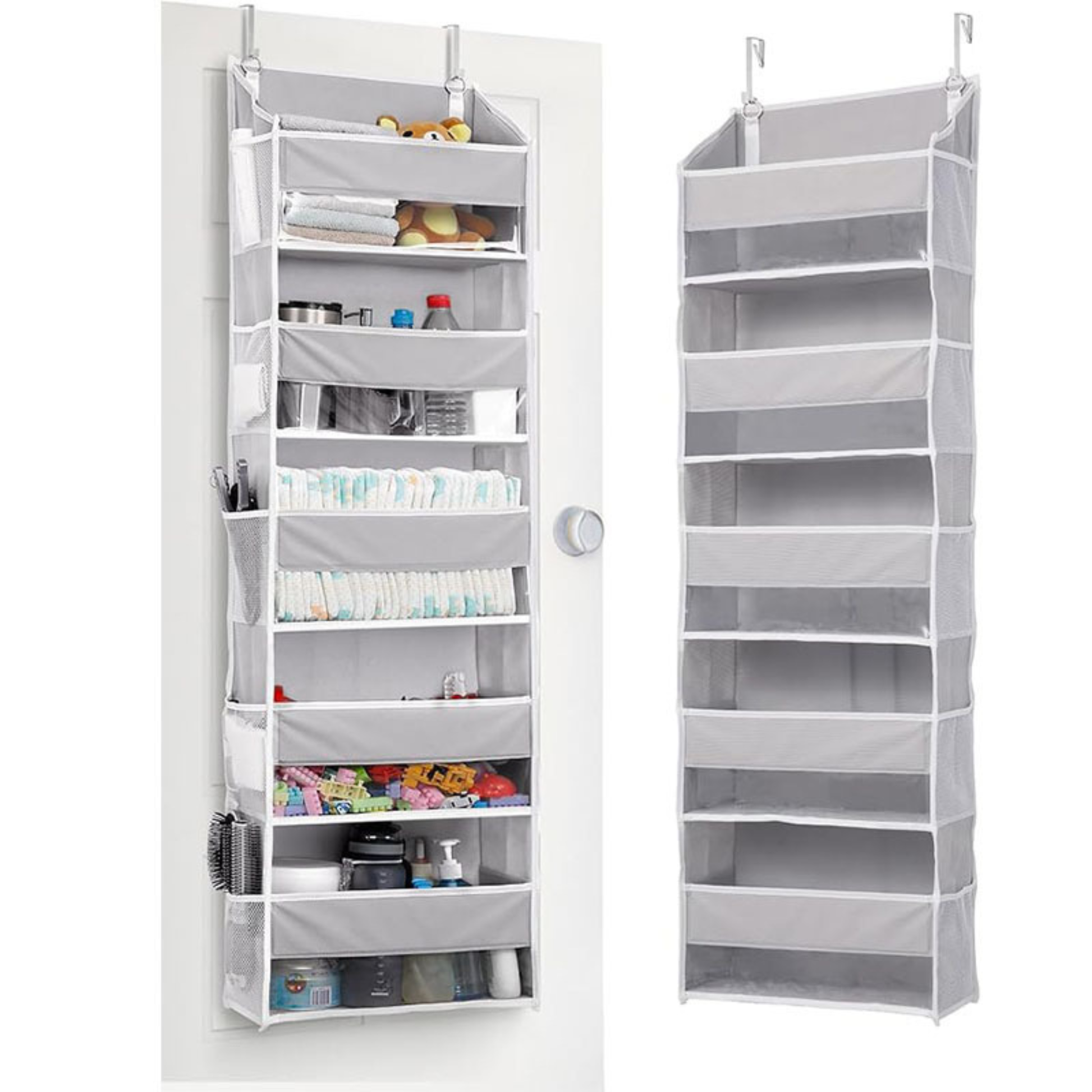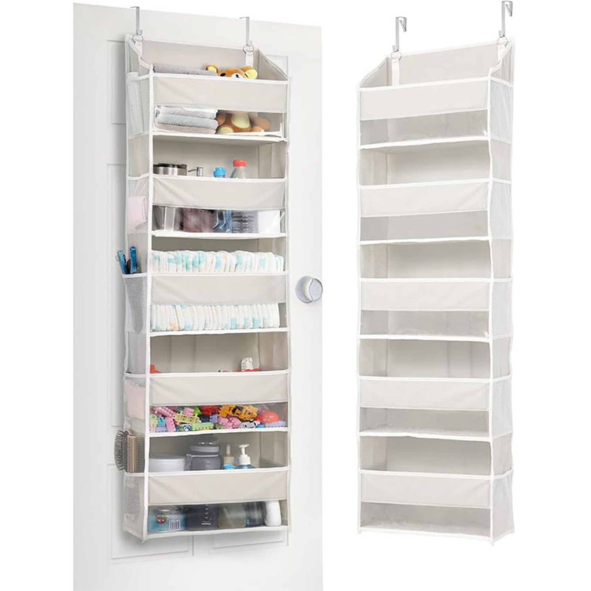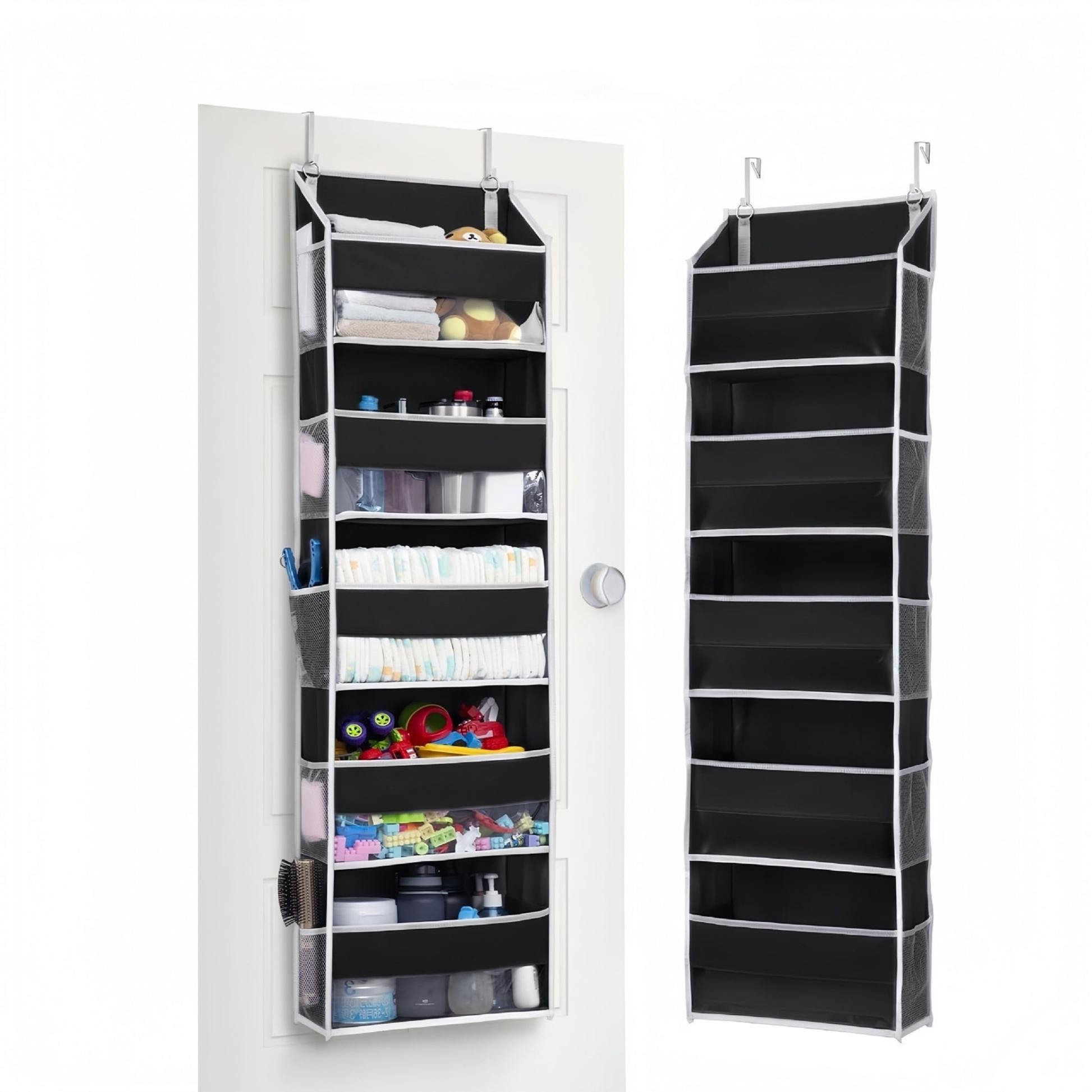 ORGANEST hangs over any standard door and gives you five deep, structured tiers plus ten side pockets — in a space that was completely wasted before. Everything visible. Everything reachable. No tools. No drilling. No damage.