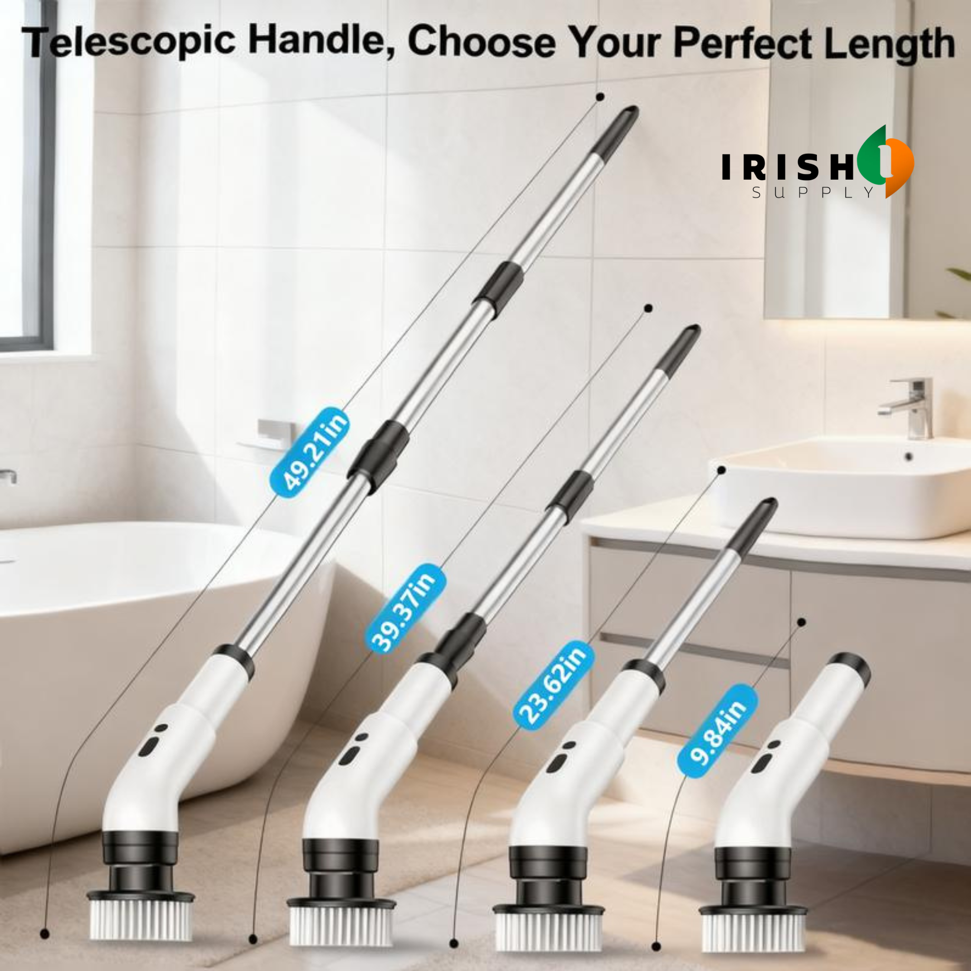 ✔️ Multiple interchangeable brush heads — tubs, tiles, grout, glass, and corners